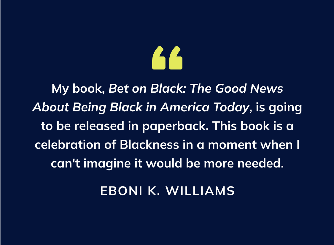 EKW: My book Bet on Black: The Good News About Being Black in America Today first debuted in hard copy back in January 2023. It went on to be a bestseller on Amazon and various other platforms, and now it’s going to be released in paperback, which I’m really excited about. It’s a testament to the book’s popularity and the need for this kind of book in this exact cultural moment. This book is a celebration of Blackness in a moment when I can’t imagine it would be more needed.