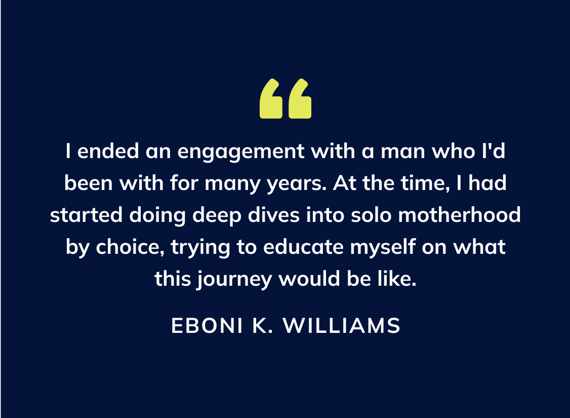 EKW: I froze my eggs at 34, and I was disappointed at the onset when I was told that I only retrieved 10 eggs—at my age, I was expecting more. I could’ve done another egg retrieval, but I didn’t, in part because I wasn’t particularly clear whether I even wanted to pursue motherhood in the future. I stored them away and didn’t think about them for a few years. And then life and the pandemic happened, and I ended an engagement with a man who I’d been with for many years. He was older and already had three children, and while he purported to be open to more children; turns out he wasn’t open to it. That was very heartbreaking, and left me in a position to make some big-girl decisions. At the time, I had started doing deep dives into solo motherhood by choice, trying to educate myself on what this journey would be like.