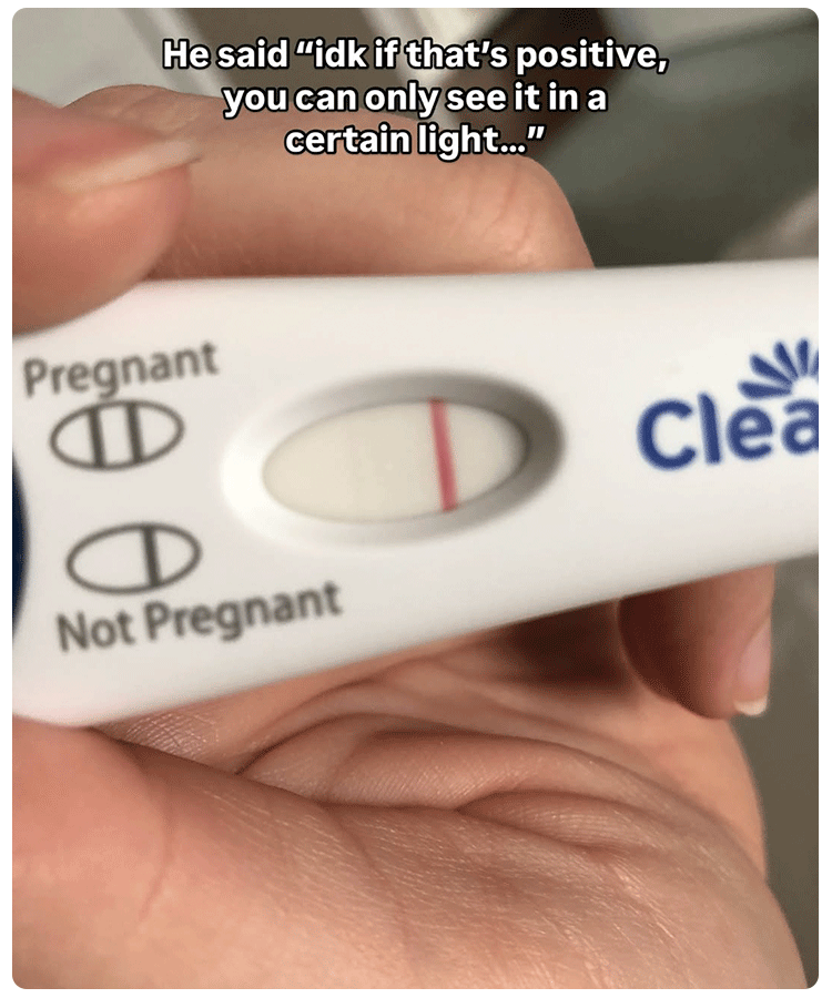 In this scenario you’re definitely pregnant, but you’ve taken the test very early on in your pregnancy—before hCG levels are high enough to register a strong positive result—aka an unmistakable dark line. (This is what happened to me.)