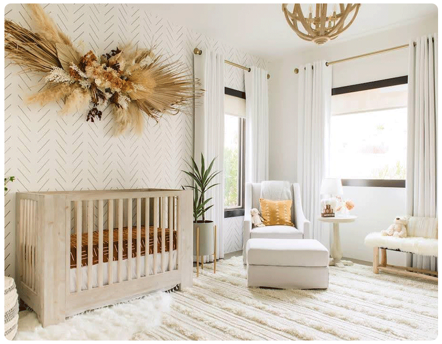 A soothing yet stylish take on bohemian design, this nursery from Little Crown Interiors layers neutral tones with natural textures and organic accents. The dried floral wall arrangement makes a striking focal point, while the pale wood crib, soft textiles and woven details keep the space cozy and inviting. This timeless boho aesthetic feels grounded and works beautifully as a gender-neutral choice.