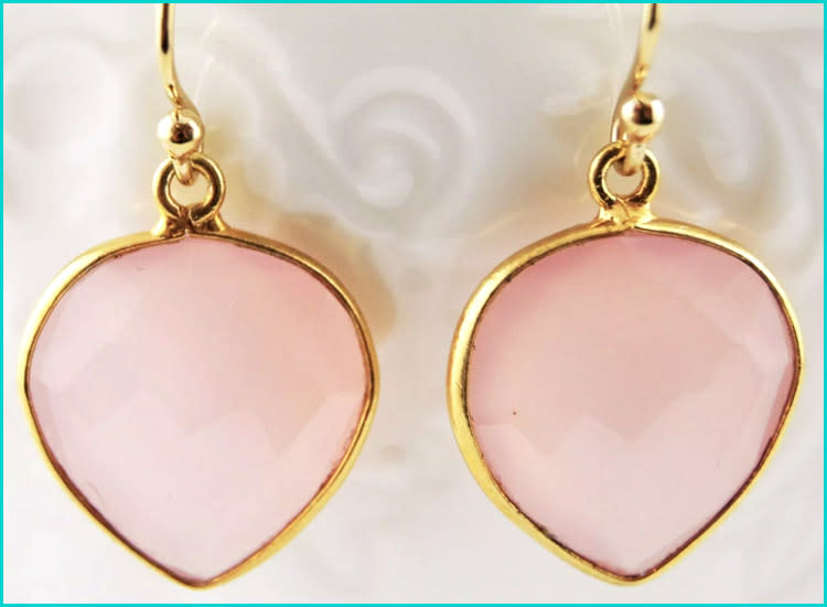 Celebrate your unconditional love for baby with soft rose quartz earrings. The piece of healing crystal jewelry is triangular shaped to symbolize a mother’s heart.
