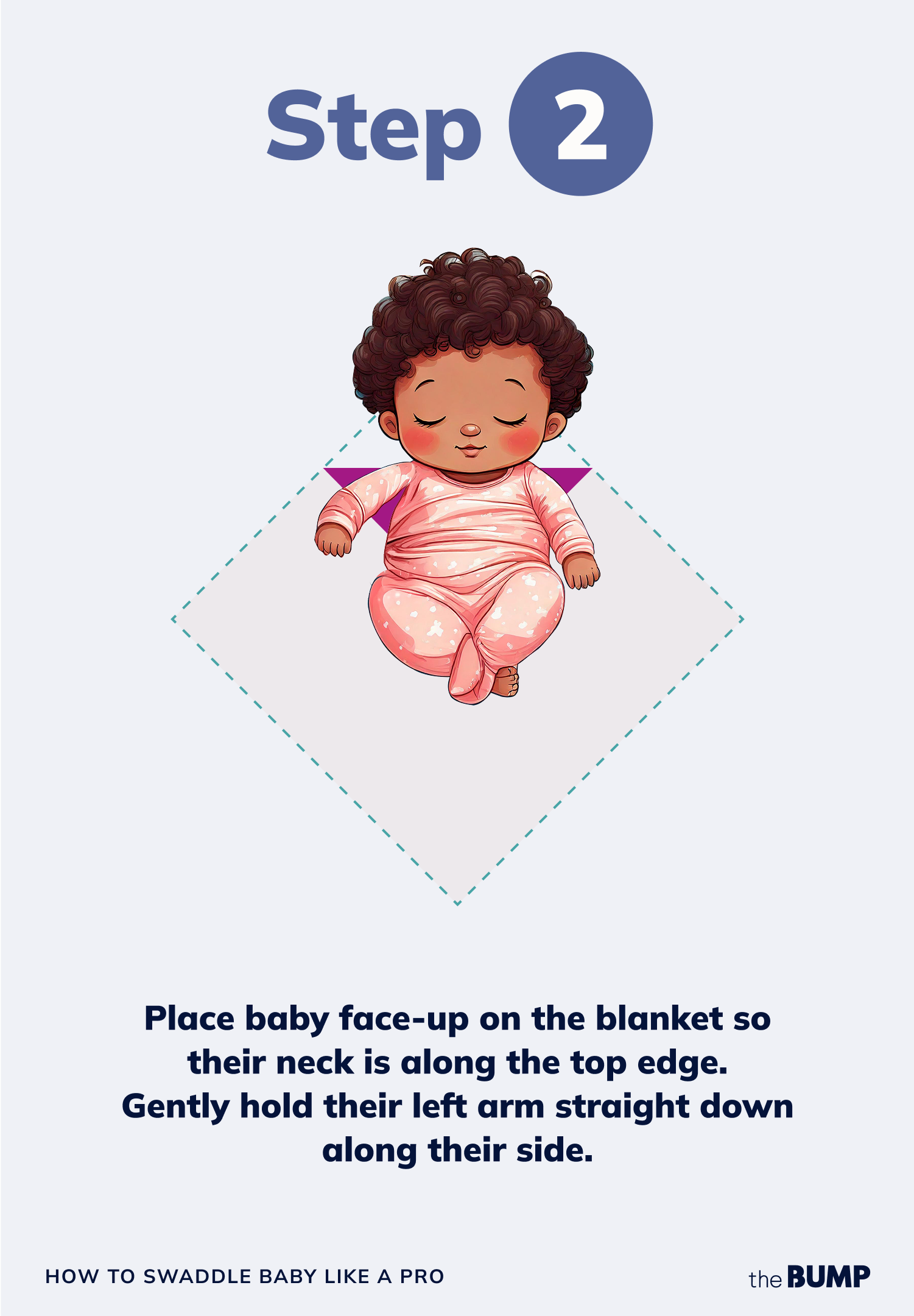 Step 2: Place baby face up on the blanket so that their neck is along the top edge. One tip as you learn how to swaddle a newborn: Don’t let the blanket touch baby’s cheek. They may think it’s a breast—this could set off the rooting reflex and make them cry in confusion at not being fed.