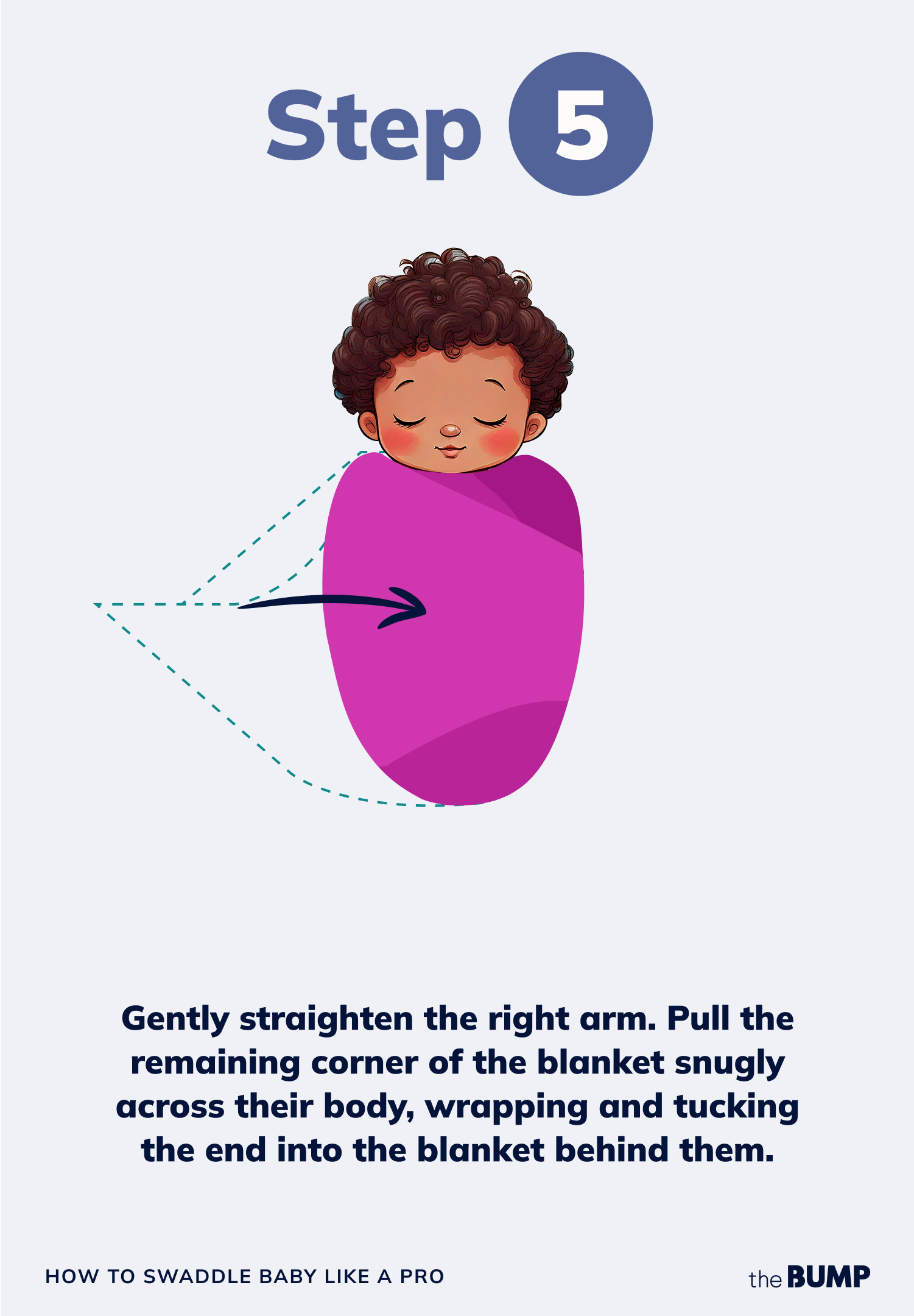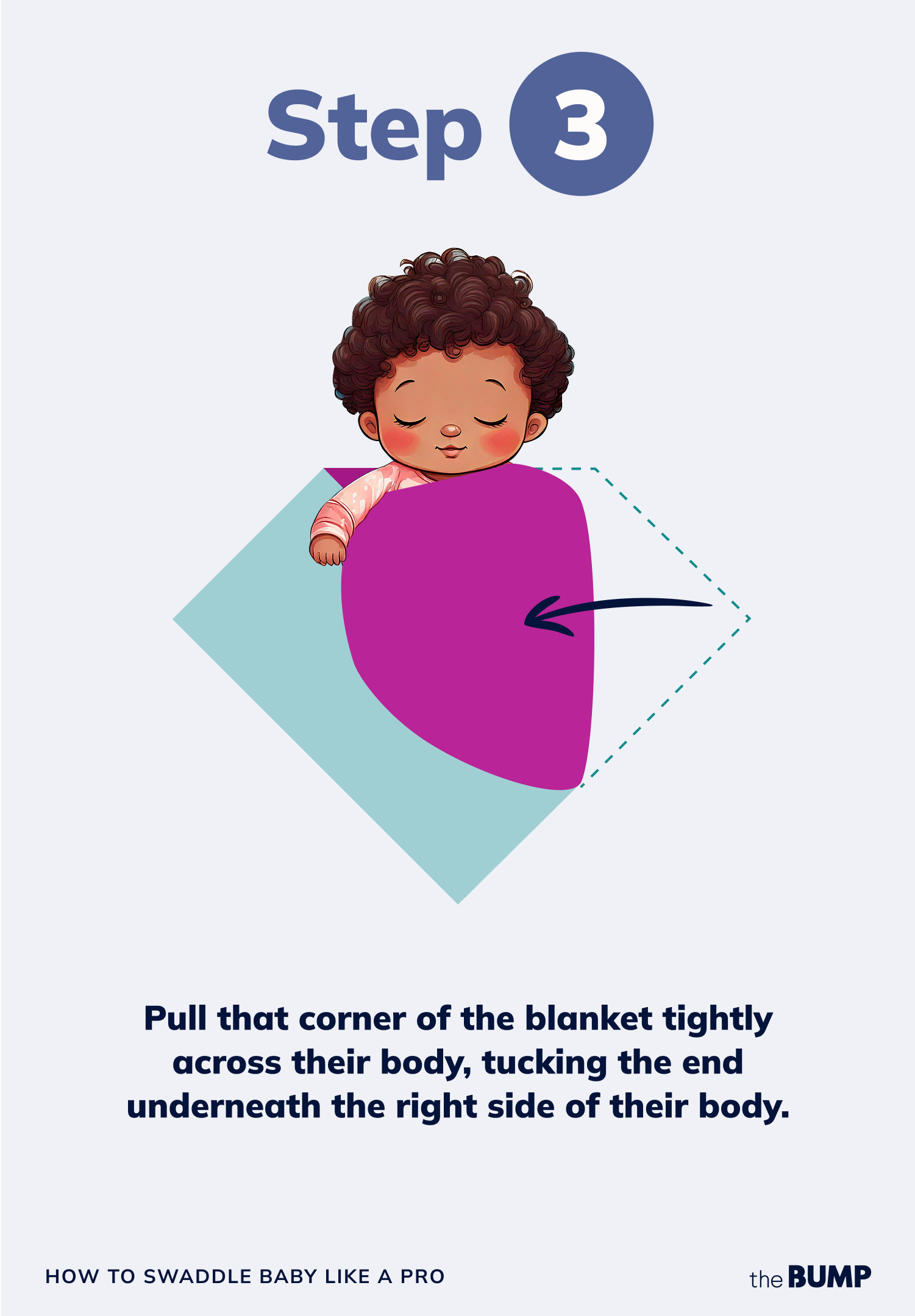 Step 3: Gently hold baby’s left arm down along their side. (If baby’s arms are bent over their chest, they can wriggle out of the swaddle.) Take the blanket about 4 inches from baby’s left shoulder and pull it down and across their body tightly, tucking it underneath them on the opposite side. It should be snug, but not overly tight, without any slack.