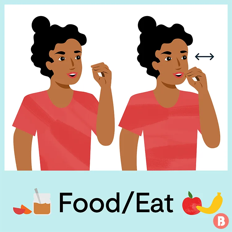 Instead of signing “hungry,” baby may want to ask for “food.” This sign can also mean “eat.” Communicate “food” in sign language by flattening your fingers on top of your thumb and then bringing your fingertips to your mouth.