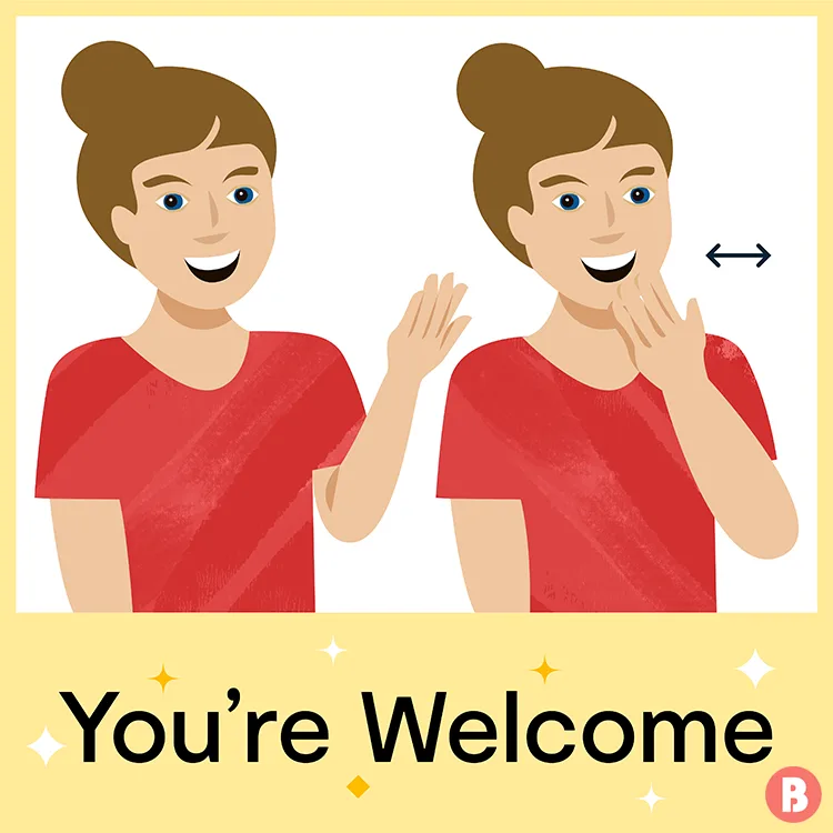 The sign for “you’re welcome” is the same as the sign for “thank you”—flatten your hand, bring your fingers to your chin and pull them back.