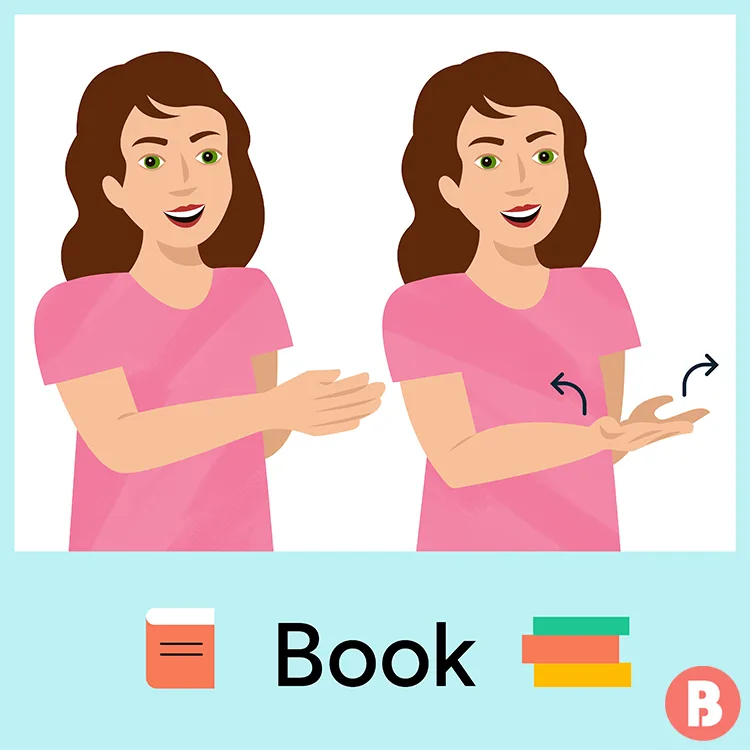 Storytime is the best time! Use your hands to say “book” in sign language; clasp your palms together with your thumbs facing up, then hinge open your hands, keeping your pinkies together (as if you were cracking open a book).