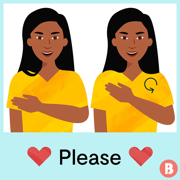 Manners matter. Teach baby to ask for things politely from the get-go. To sign “please,” extend your fingers and thumb out, then rub your flattened palm against your chest in circles.