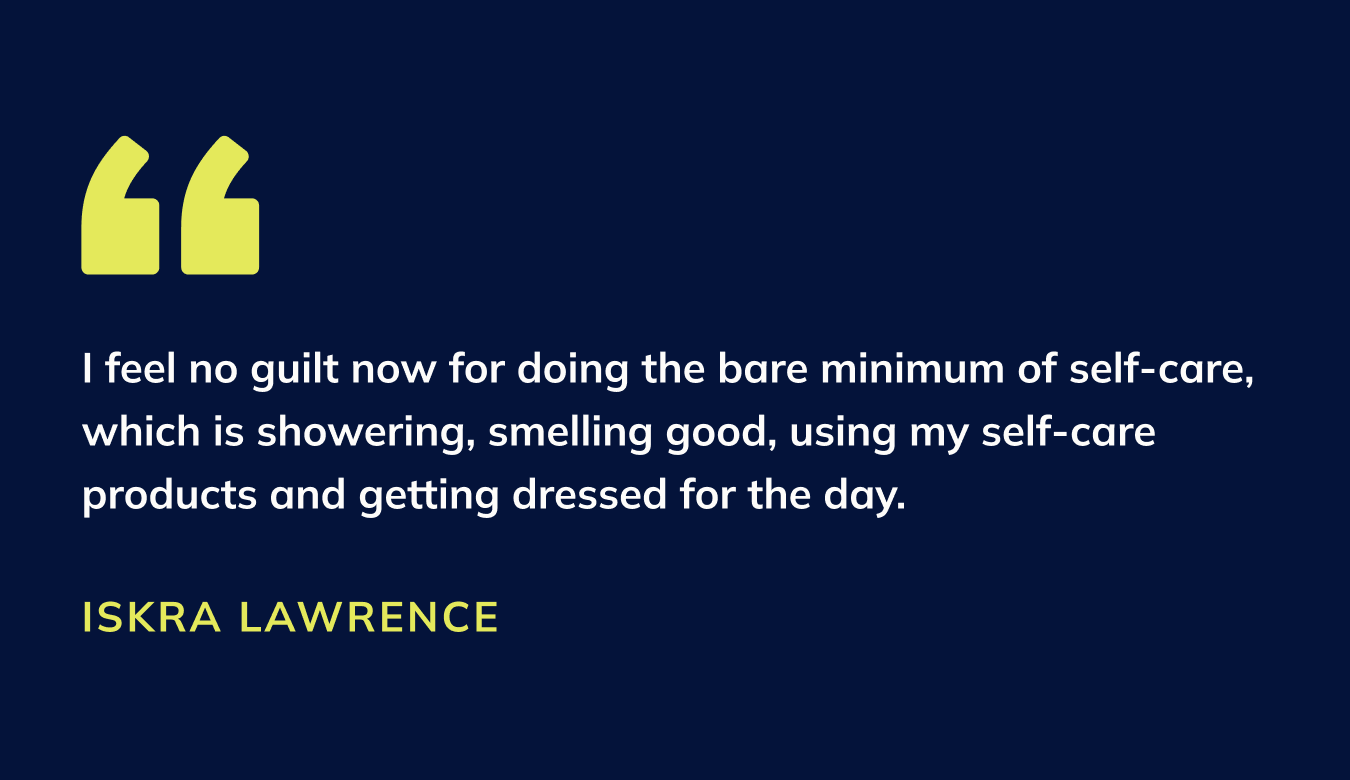 IL: This time around, I said “I’m not feeling guilty for showering every day.” And I know you’re probably like, “Why would you feel guilty for that?” Well, my son was so colicky, I felt like I couldn’t put him down for even five minutes to take a shower. It was really intense those first three months with him, and he just wasn’t sleeping at all. He only could do 45 minutes at a time all through the day and night. It was all consuming. So I wouldn’t even take a shower and put real clothes on. I lived in a robe, my hair was greasy, I started to get acne. I just wasn’t looking after myself at all… So I’ve stopped feeling guilty… I feel no guilt now for doing the bare minimum of self-care, which is showering, smelling good, using my self-care products and getting dressed for the day.