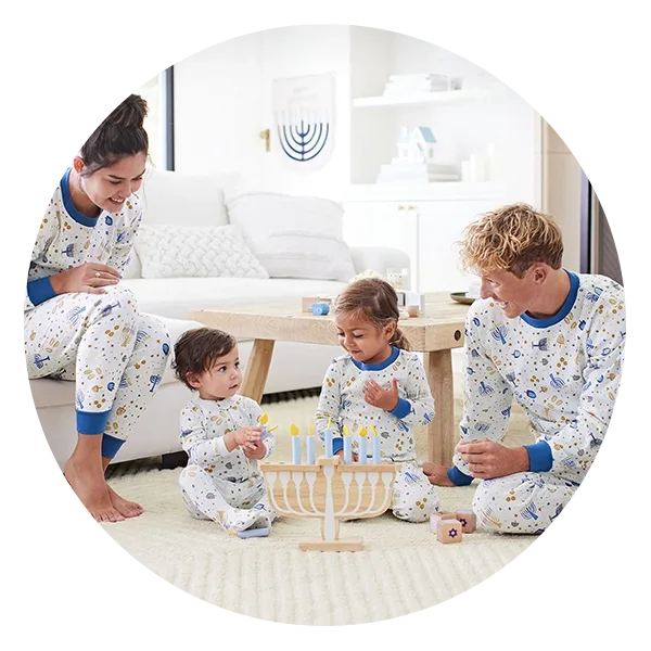 You and your loved ones are sure to have eight nights of sweet dreams in these matching family Hanukkah pajamas. Choose from zip-front baby onesies and two-piece sets for tots, kids and adults—and don’t forget a matching bandana for your pet!