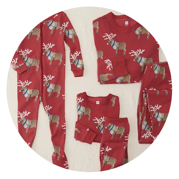 Searching for chill matching Christmas pajamas that the whole fam will love? Look no further than these cozy polar bear-printed styles from Hanna Andersson. The versatile blue-and-white pattern is sure to be a hit with everyone. Even better, coordinated, knit accessories—like a kids’ beanie and sweater for Mom—are also available.
