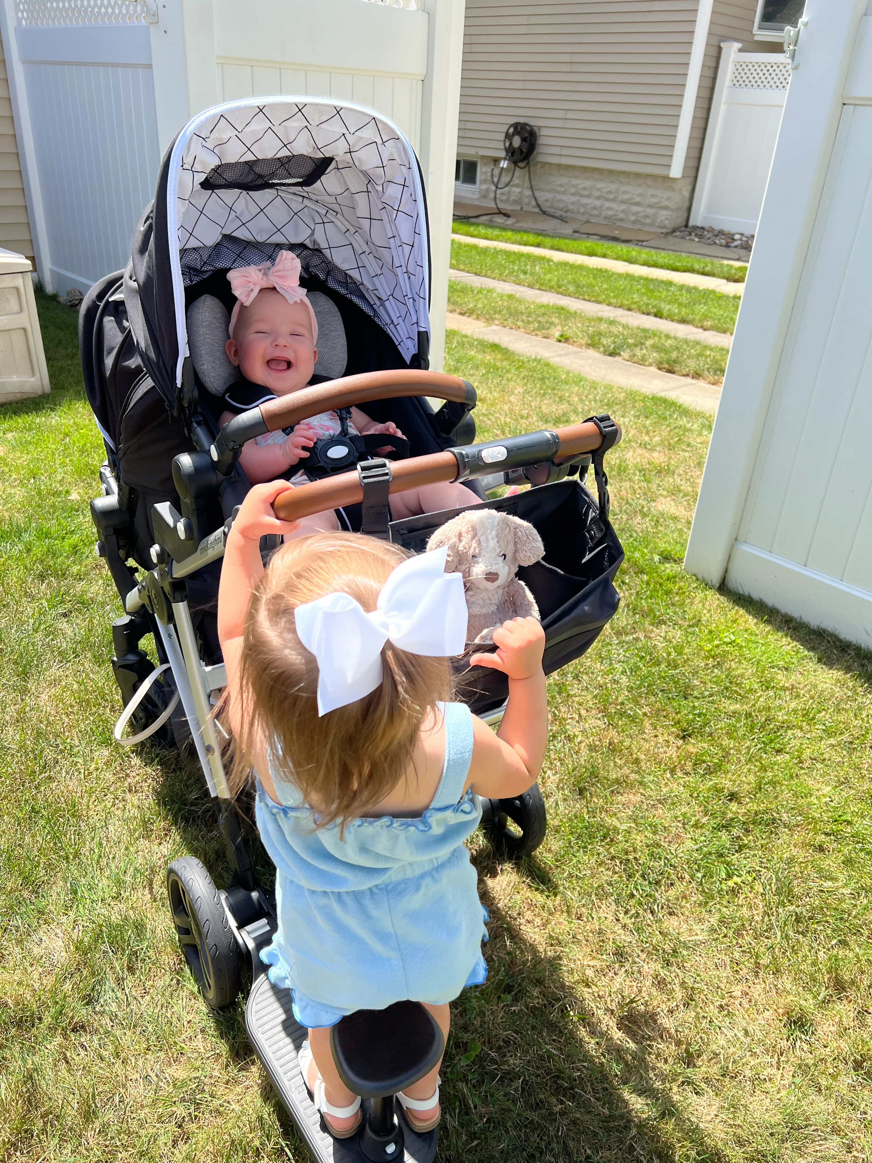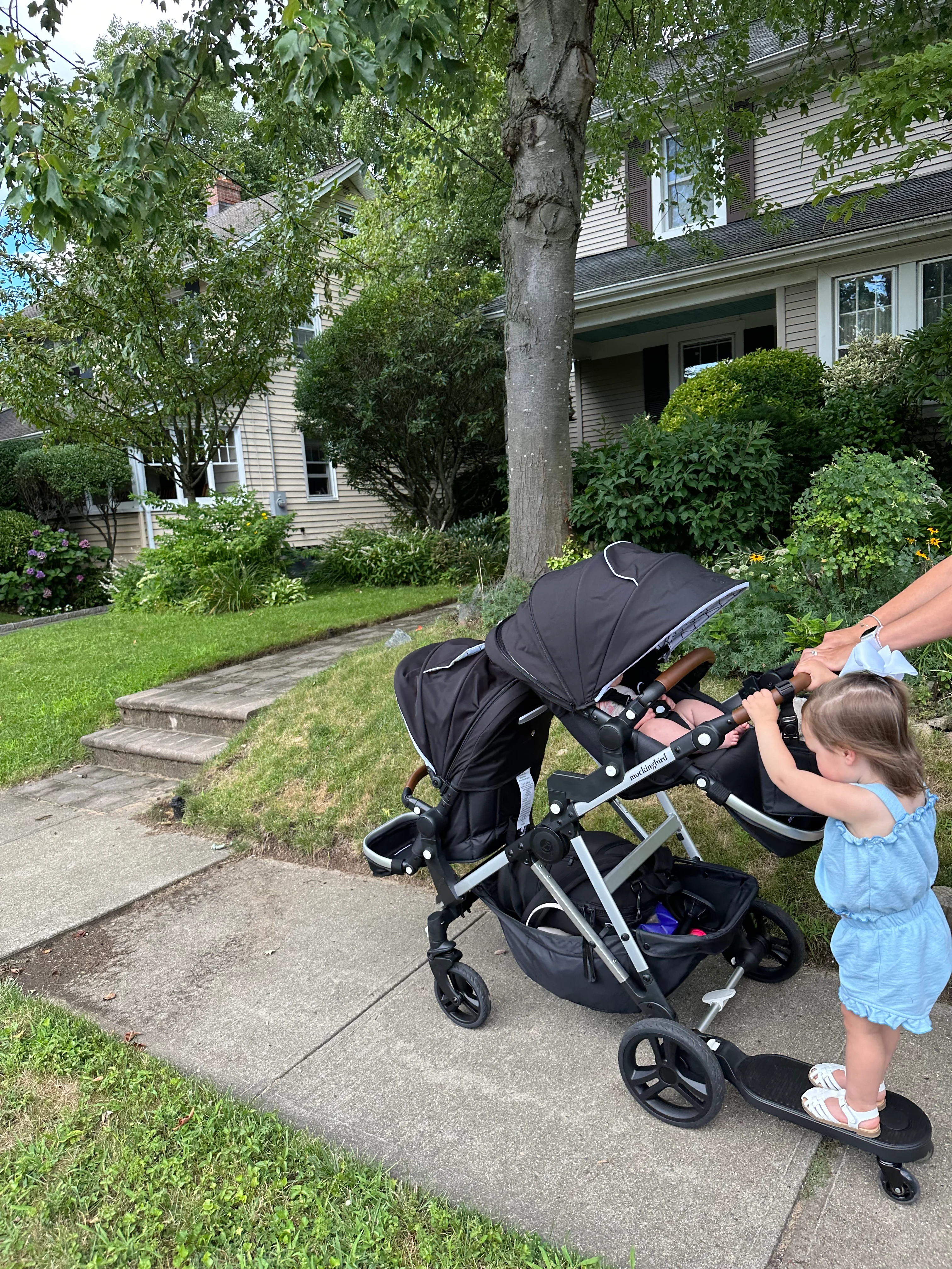 Last but not least: The ride-on board. This was a tremendous hit with my toddler! I really loved that unlike other boards I’ve seen or used, this board sits out to the side of the stroller rather than right in front of you as you push. It gave my toddler more room to ride comfortably and protected my feet from getting stubbed on the board, all while still allowing me to hold onto her hand and feel like she was riding safely and securely. It was great that we also had the option for her to ride standing up or seated on the small stool attachment. My one suggestion would be to add a hand loop or something for the child to hold onto when seated, because it was a little harder in that position to make sure she was secure, particularly when going around bumps or making turns.