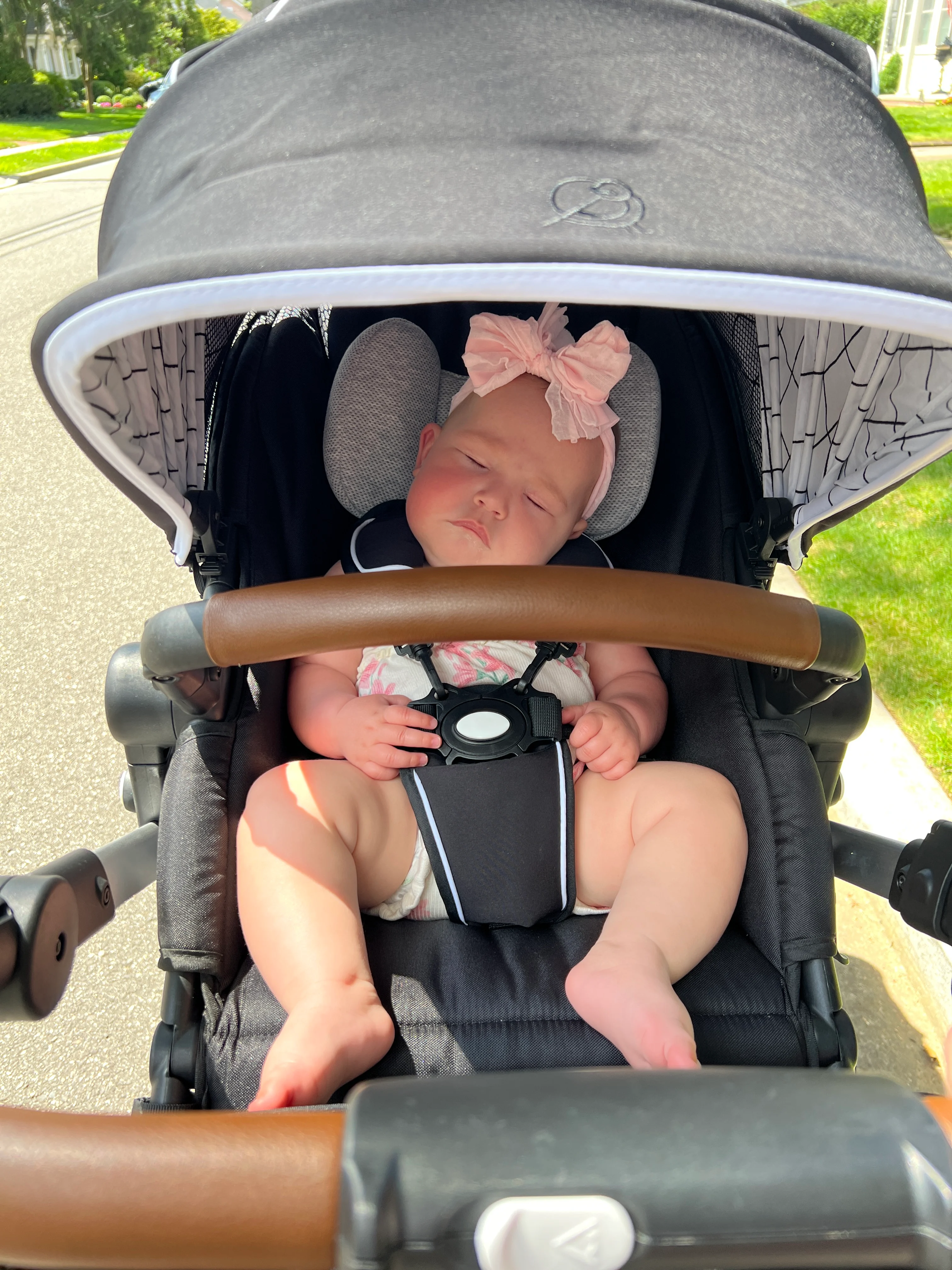 Both my toddler and infant were big fans of the seat, which offered a variety of reclines depending on the type of walk we were taking. On our first walk, my infant (who typically can’t get comfortable enough to fall asleep in the stroller, as she is a bit bigger for her age) was comfortably out cold within 10 to 15 minutes of starting our walk.