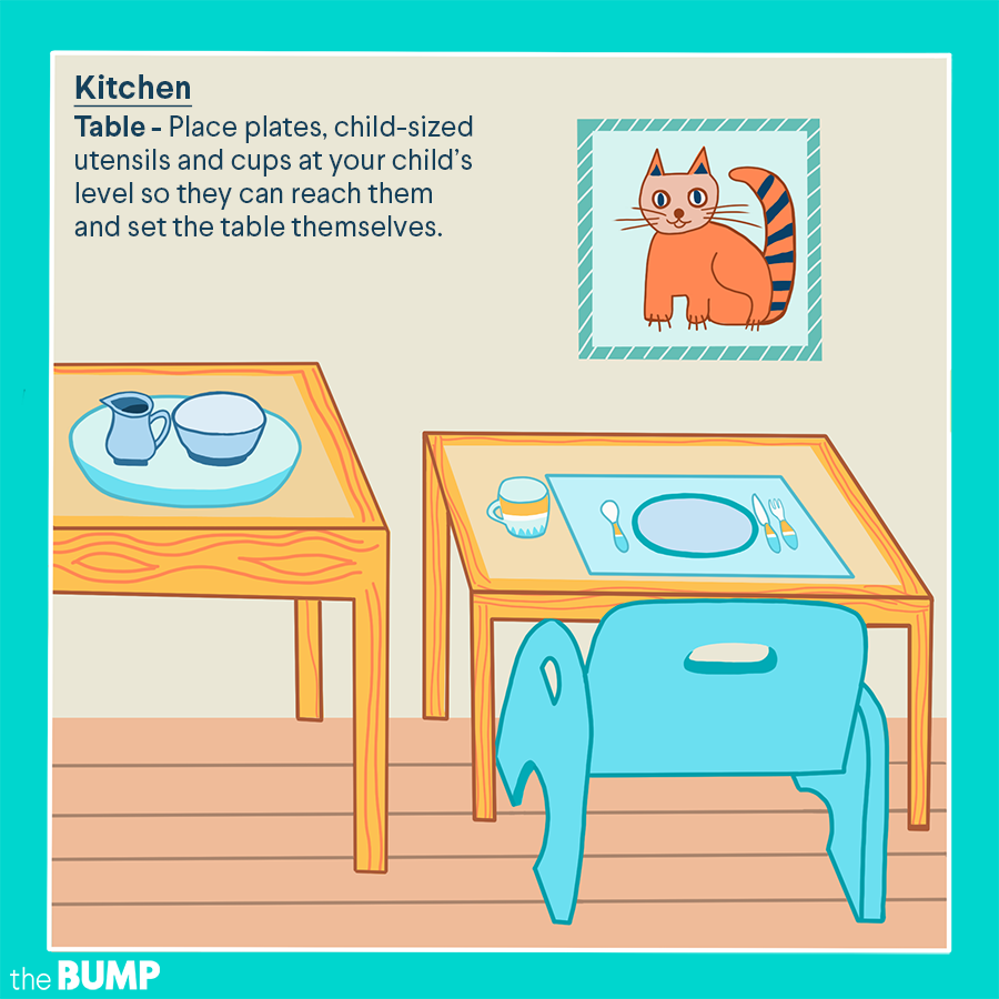 • Have your toddler set the table. Riordan recommends placing plates, child-sized utensils (including child-safe knives) and cups at your child’s level so they can reach them and set the table themselves. Sherwood says she prefers to use real glasses “because we want children to understand there is a level of carefulness that you need to present when you have something like that in our hands…if you only have plastic, you’re not exposing them to understanding what can happen when it breaks.”
