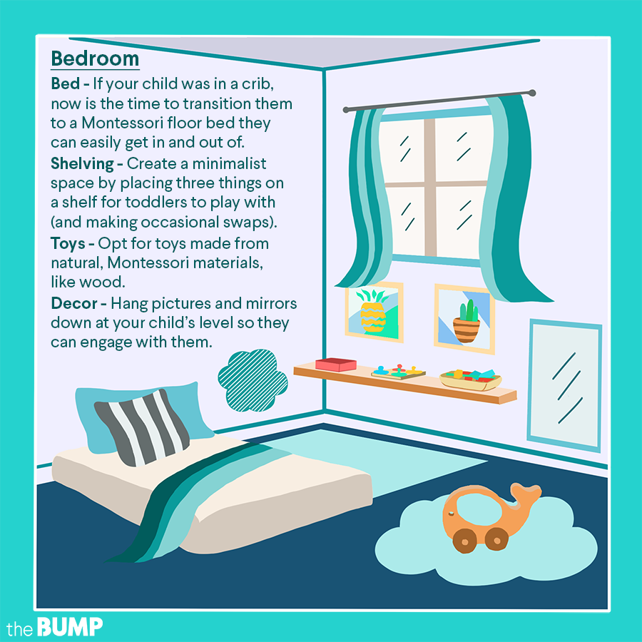 • Install a Montessori bed. If your child was in a crib, now is the time to transition them to a Montessori floor bed or other low-to-the-ground bed that they can easily get in and out of on their own.