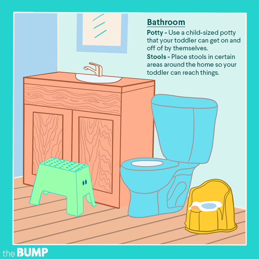 • Use stools to boost your toddler’s independence. A few well-placed stools can help put things within reach for the little kids in your home. Most common is a bathroom stool so your toddler can reach the sink themselves, but something like a learning tower in the kitchen is a great option as well.
