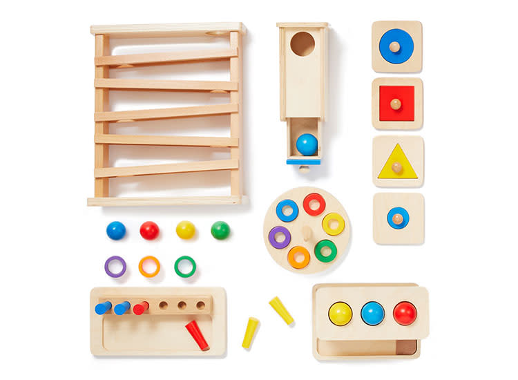 The Montessori materials in Monti Kids Level 4 are thoughtfully designed for this stage of life as the toys encourage young toddlers to experiment with cause and effect to boost their memory and problem-solving skills. The Tracker, included in this box, is a quintessential Montessori toy. It encourages the act of squatting, standing and squatting again to place and retrieve the balls on repeat, which is great practice for a child’s balance. Added bonus - the box can be split into six gifts to place under the tree!