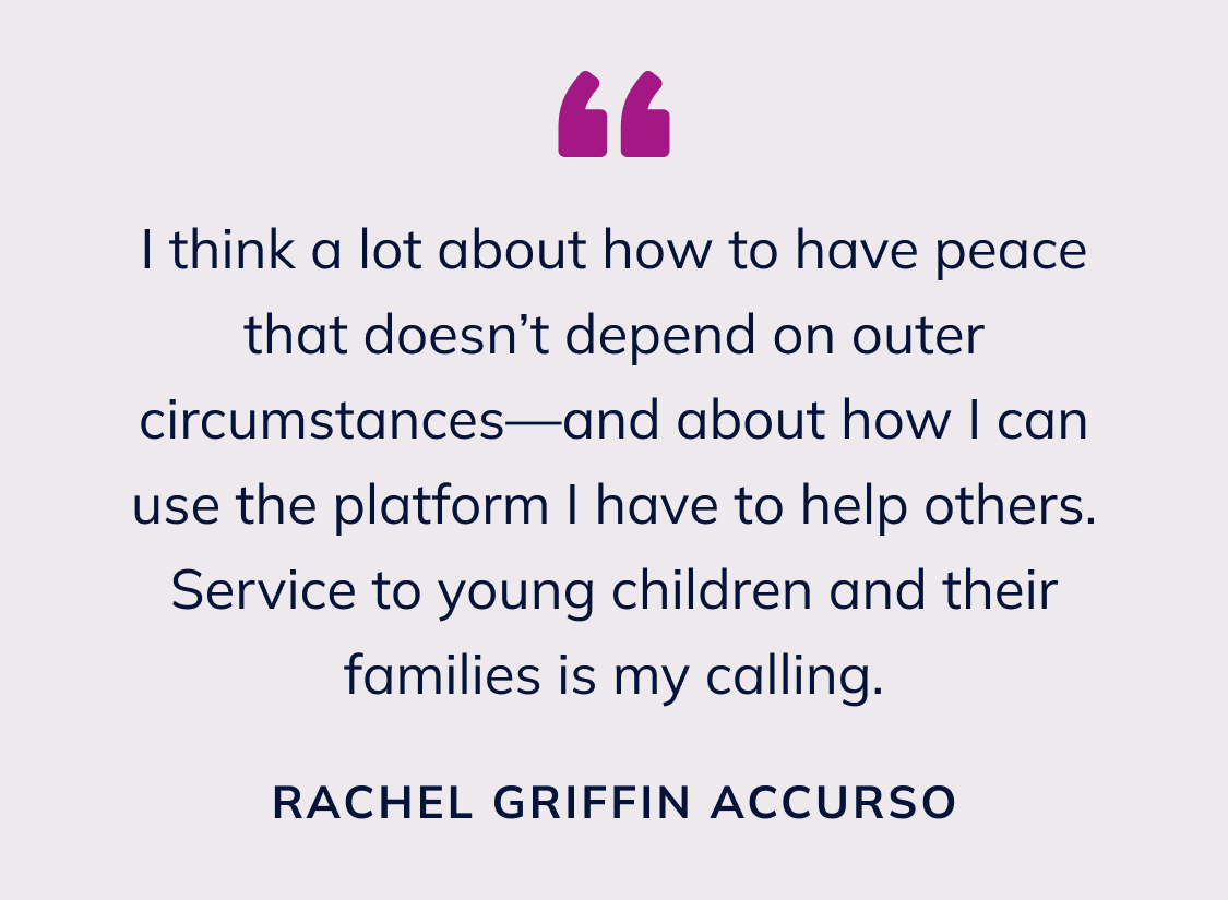 RGA: Time to myself? What’s that?! We do family dinner, which is important to us. We love our work, but it’s important to us to have a work-life balance. We adore being with our son. I’m getting better at saying “no,” which I’m proud of! I make time to pray daily. I think a lot about how to have peace that doesn’t depend on outer circumstances—and about how I can use the platform I have to help others. Service to young children and their families is my calling.