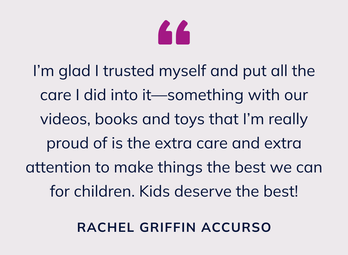 RGA: I learned that you need to go with your gut and trust yourself. I had written a different first book that was edited and all set; then in the middle of the night one night I woke up and thought, “I have a different idea that I think will be better!” I rewrote the whole thing. I care so much about our audience, and really wanted this to be special. I’m glad I trusted myself and put all the care I did into it—something with our videos, books and toys that I’m really proud of is the extra care and extra attention to make things the best we can for children. Kids deserve the best!