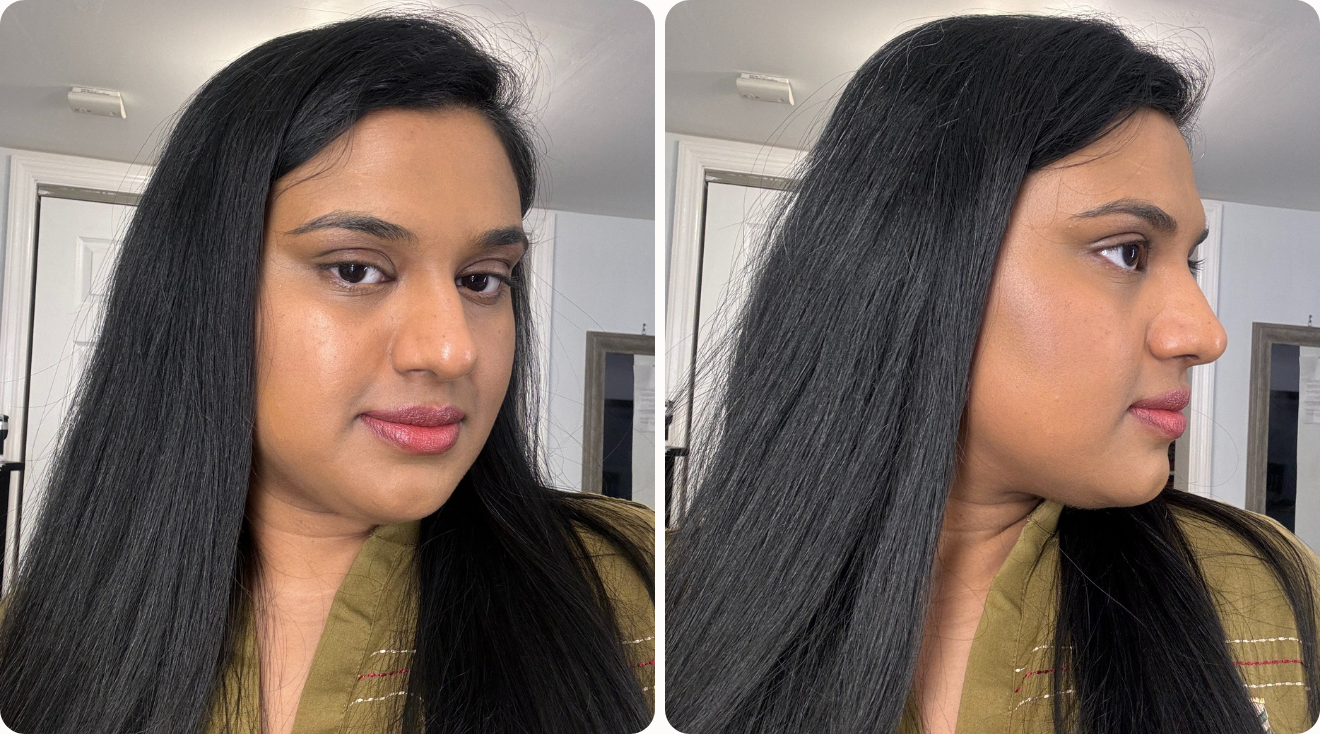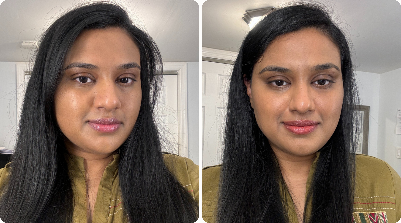 “The packaging is simple and user-friendly, which I appreciated,” says pregnant product tester Mahnur, who scored it a 10 out of 10 for ease of application. “You just glide it onto your face to achieve even coverage, and it doesn’t require a lot of product for effective results,” she continues. Mahnur used her fingers to apply the product for a quick everyday application, but also tried using it with a foundation brush to create a more polished look. In both cases, Mahnur reported that “the product took just a few seconds to blend, making it a hassle-free addition to my routine.”