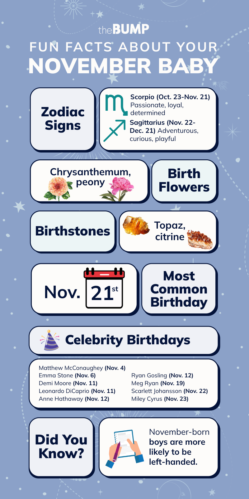 November birthday babies get to enjoy festive, late-fall vibes for their celebrations, and their parents get to soak in their bright personalities. Enjoy those cool-weather cuddles—and look forward to watching your bold bundle of joy leap through life with determination and curiosity.
