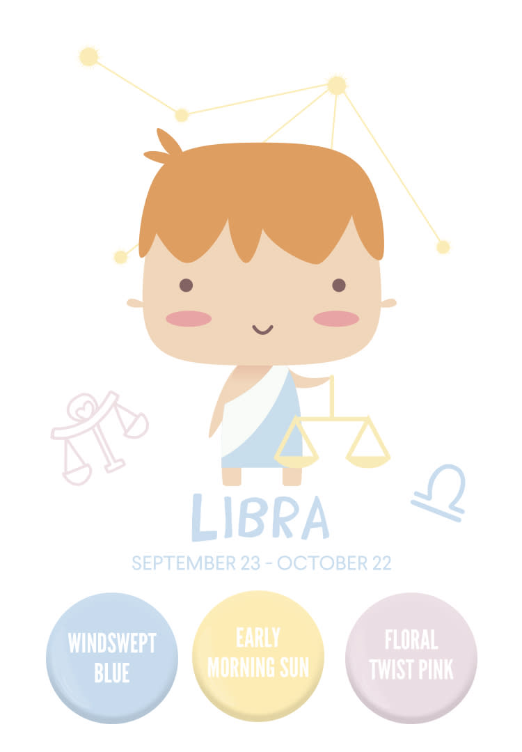 Libra’s love of being surrounded by others may have you spending more time in the nursery than you anticipated, but with a color palette as refreshing as this trio of pastels, you won’t mind one bit. Pale blue, dusty yellow and blush pink complement Libra’s easygoing and charming personality. Consider choosing one statement color to paint stripes on an accent wall for an extra-stylish touch.