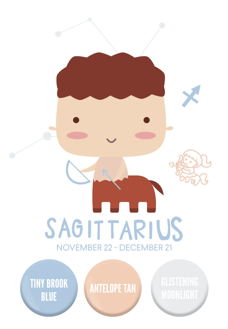 Those born under the Sagittarius sign love travel, learning new things, and the freedom of wide open spaces, so consider going with an exploration and adventure-inspired nursery. Use a palette of peachy orange and misty light blue to create a feeling of excitement, then add a teepee in one corner (perfect for playtime), and paint some mountains and a cluster of fluffy clouds on the wall behind it.