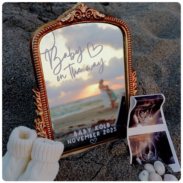 In this beachside announcement captured by Samantha Farmer Photo + Film, a mirror placed in the sand reads “Baby on the way,” along with the due month, while ocean waves roll in behind the couple as they dance in the mirror’s reflection. “The goal was to create something that felt less staged and more like a memory—soft, sentimental and deeply personal,” says photographer Samantha Farmer.