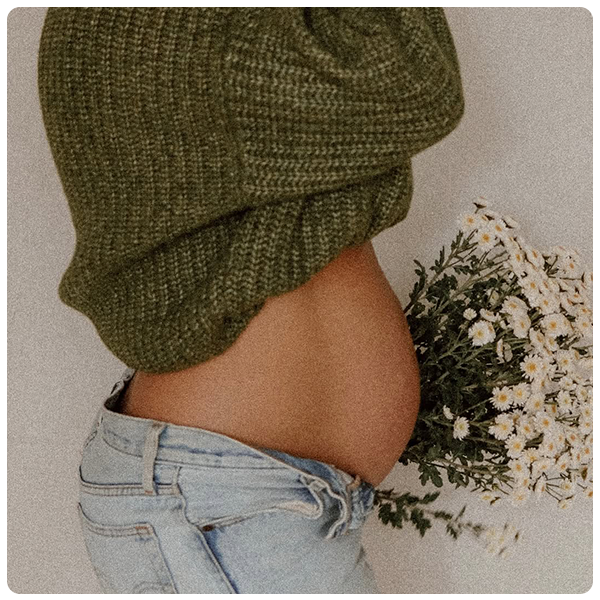 This understated baby announcement from @our.curated.chaos puts a fresh twist on the classic bump photo by pairing it with a bouquet of flowers and the caption “in bloom.” By focusing solely on the growing baby bump, the shot highlights the mom-to-be carrying baby, turning a simple image into a meaningful, symbolic way to share the news.