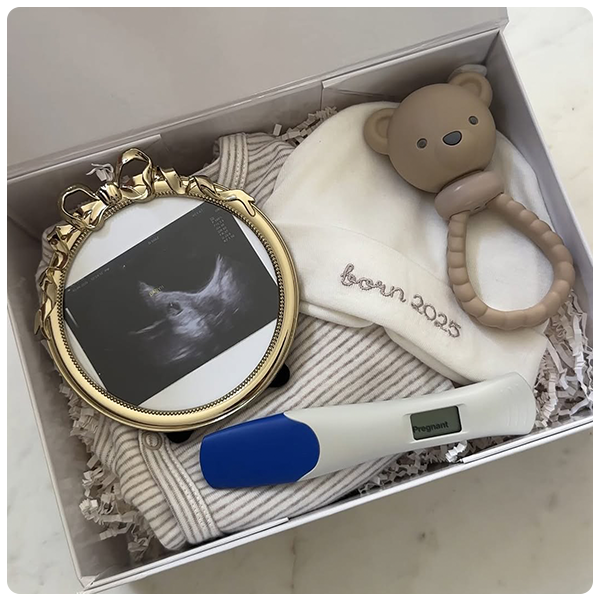 Daiana D., a mom of one in San Diego, created a pregnancy announcement box for her parents filled with confetti, a baby onesie, a personalized “born in 2025” beanie, a rattle, a framed sonogram and her positive test—a beautiful way to transform everyday items into a heartfelt, shareable pregnancy announcement.
