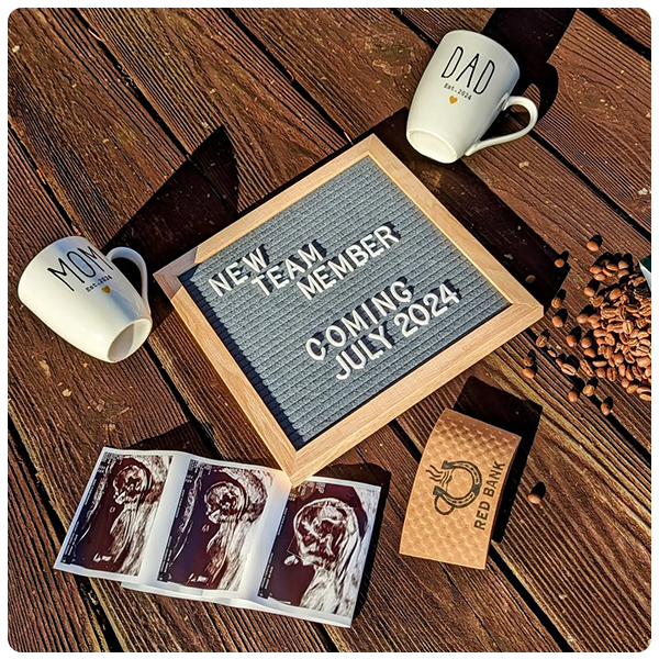The owners of specialty coffee shop Coffee Corral announced their pregnancy with a cozy, coffee-themed setup featuring a letterboard, ultrasound photos, matching “mom” and “dad” mugs, and scattered coffee beans. This personal and warm styling ties their growing family into the everyday details of their business.