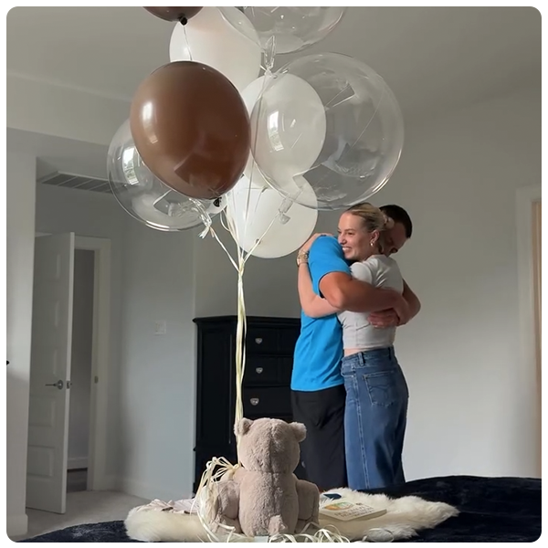 Vanessa Louise Miller, mom-to-be and owner of DeliciousNess Bakery, shared the news with her husband with a bouquet of balloons tied to a teddy bear on their bed and recorded his sweet reaction as he opened the door. Their embrace and giggles say it all: “It was a magical day,” reflects Miller.