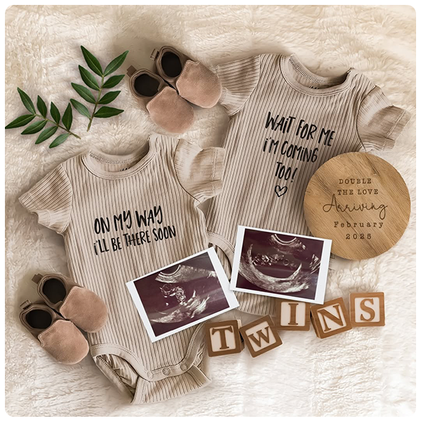 For a twin pregnancy announcement, one popular approach is a styled flat-lay that visually tells the whole story at once. In this example from Rachel of Twin Mom Social Club, two neutral ribbed onesies—each paired with its own ultrasound photo—tell the story and spell out “TWINS.” The duplicate details subtly reinforce the news, while the adorable sentiments “on my way” and “wait for me, I’m coming too!” add a sweet, lighthearted touch.