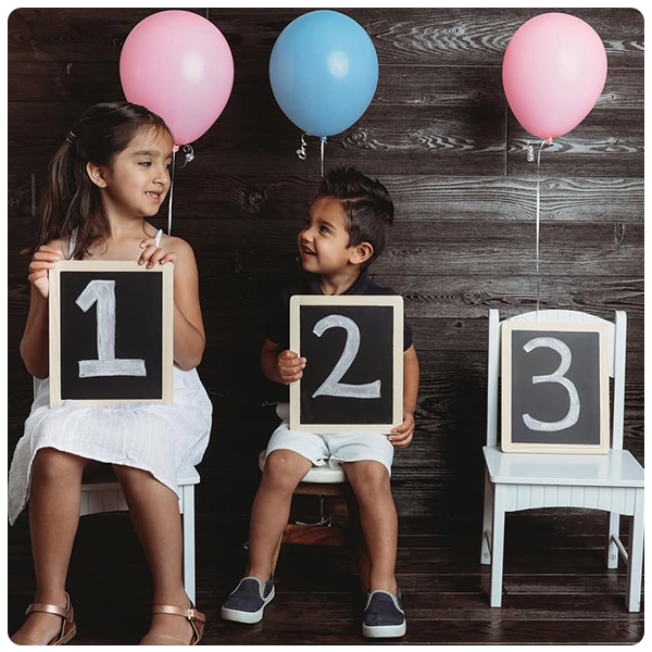 In this playful sibling announcement from @landr_photos, children hold numbered signs labeled “1,” “2” and “3,” with the final empty chair hinting at who’s coming next. Paired with pastel balloons, the setup turns a simple photo into a clever visual countdown that lets siblings be front-and-center in sharing the news.