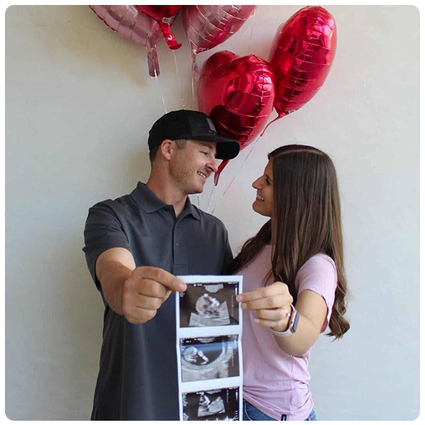 In this Valentine’s Day–inspired pregnancy announcement captured by Michelle Johnson of bloom.in.grace.photos, a couple shares the news by holding a strip of ultrasound photos while surrounded by heart-shaped balloons. The simple setup keeps the focus on the emotion between the two parents-to-be, making it a sweet option for couples who want a polished photo that still feels personal and intimate. “Capturing a pregnancy announcement on Valentine’s Day feels especially special because it celebrates love not just as it is, but as it’s becoming,” says Johnson.