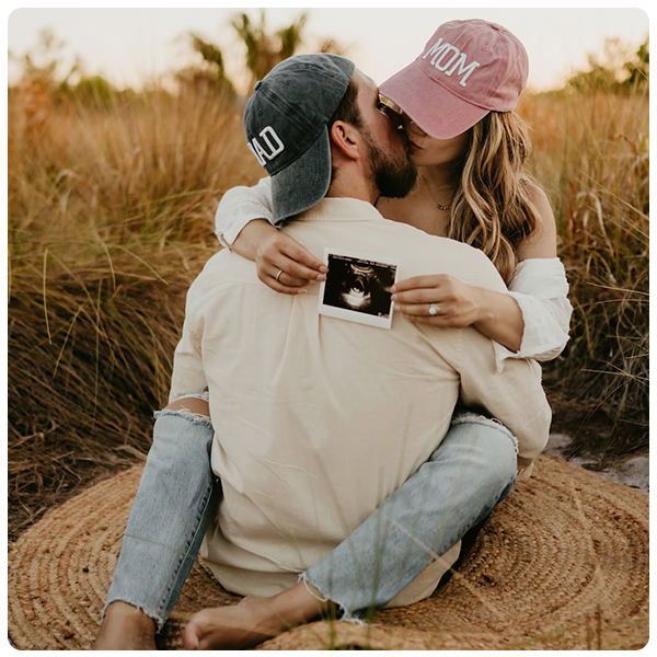 In this outdoor pregnancy announcement by Ryann Michelle Photography, the couple keeps things simple with coordinating “mom” and “dad” hats and a single sonogram photo held in Mom’s hands. The understated setup feels modern and intimate, letting the moment—and the news—speak for itself.