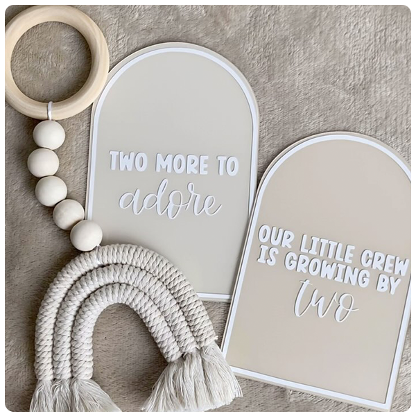 These twin coordinating neutral signs from @bonniebabygifting make a twin pregnancy announcement modern and minimalistic yet still special. By pairing complementary phrases, the setup makes it clear that two babies are on the way without needing photos or extra props.