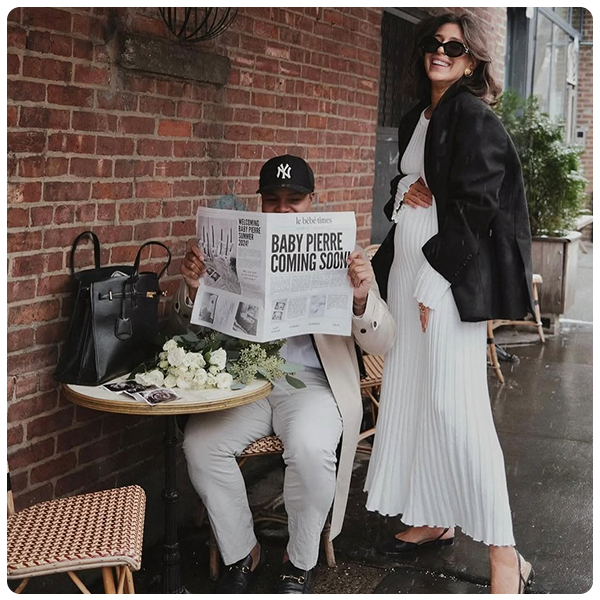 This café-style announcement from @asliceopi puts a playful spin on sharing the news, with the dad-to-be casually reading the headline “Baby Pierre Coming Soon” while the mom-to-be shows off her bump beside him. The fashion-forward setting and tongue-in-cheek headline make it an adorable option for parents who want something stylish and a little unexpected.