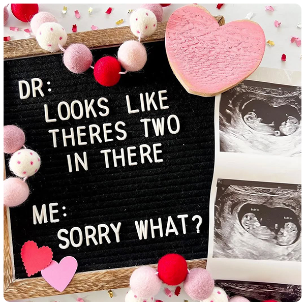 A humorous letterboard from @ashleymurphyfamily paired with twin ultrasound photos, confetti and hearts makes this announcement a playful way to share the sweet—and sometimes shocking—surprise of twins on the way.