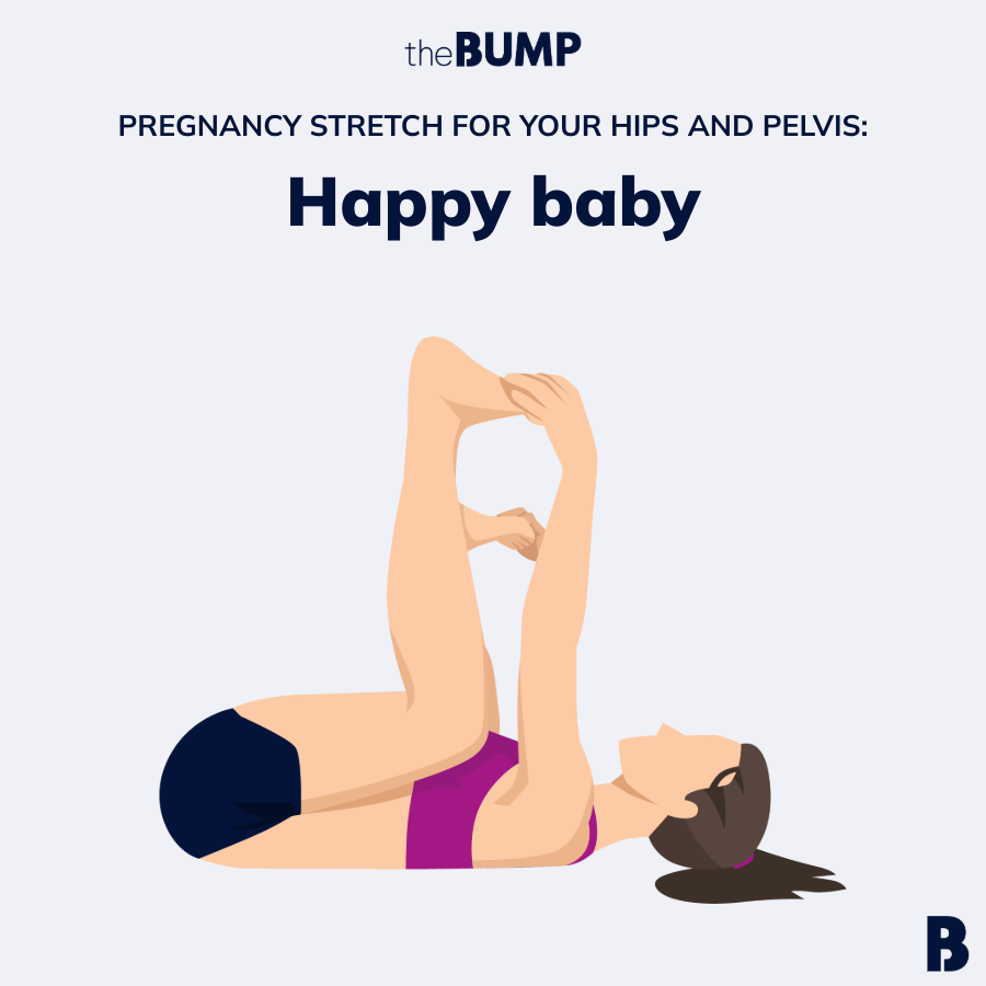 Speichinger says this hip-opening posture gently stretches the inner thighs, groin and lower back, improving pelvic floor and hip flexibility. Before 20 weeks, you can perform the stretch normally (on your back), but after 20 weeks switch to doing it on your side to avoid prolonged time on your back.