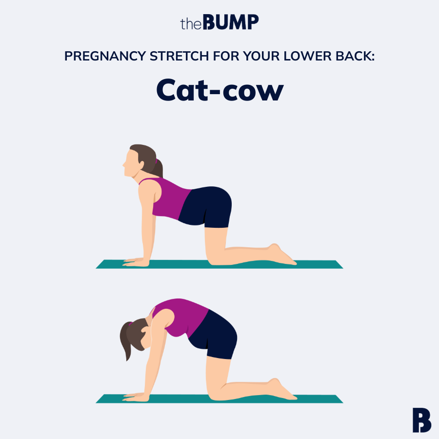 To gently stretch your back and hips, try a pregnancy-friendly child’s pose. Kneel on the floor, then sit back on your legs with your bottom resting on your heels. Slowly spread your knees wide enough to accommodate your belly. Lean forward onto your elbows and hold the stretch, or—if you can—extend your arms all the way out in front of you and rest with your chest on the floor. You can also lean on a stability ball, if needed, instead of lowering down to the floor.
