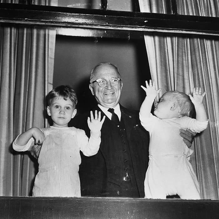 President Truman and his two grandkids smile for a photo from an apartment window in Manhattan. While Clifton looks towards the camera, his younger brother William looks back at grandpa.