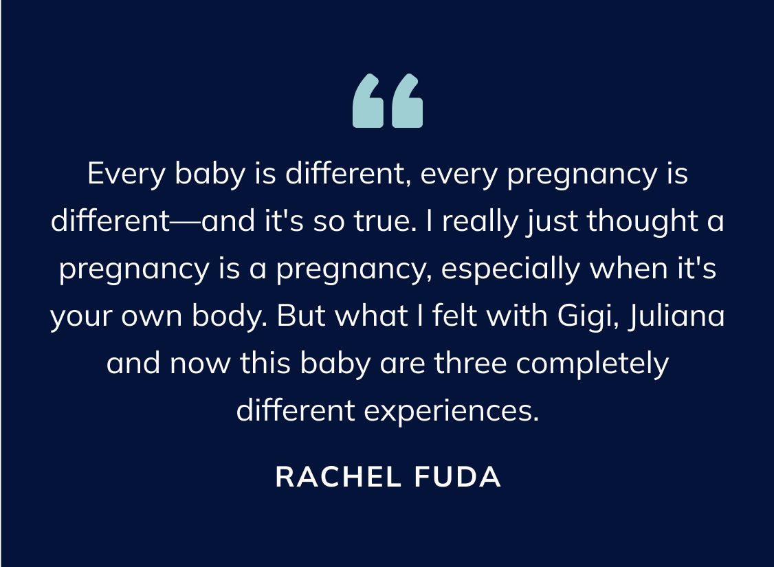 Rachel Fuda: How different every pregnancy is. I feel like you hear that all the time—every baby is different, every pregnancy is different—and it’s so true. I really just thought a pregnancy is a pregnancy, especially when it’s your own body. But what I felt with Gigi, Juliana and now this baby are three completely different experiences. After this, I’m good. I don’t need to do this again. My second pregnancy was, by a landslide, the easiest. And this has definitely been my most challenging pregnancy.