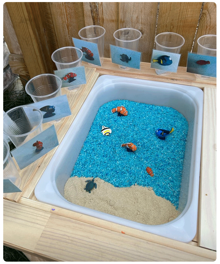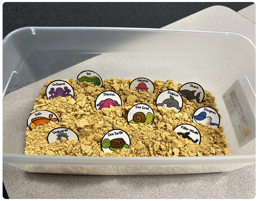 This simple and mostly edible sensory bin lets little ones learn about sea creatures (while munching on “sand,” aka graham crackers).