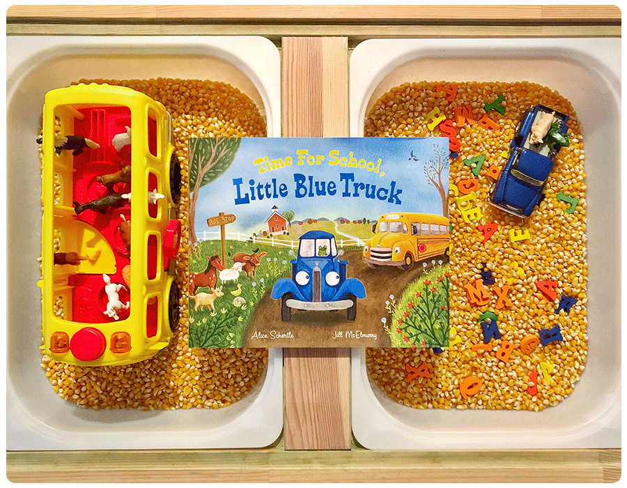 Kimberley Kirby from Fab Everyday loves pairing books with sensory activities, and Little Blue Truck is her favorite. For this sensory bin, she used a corn base, and added a school bus, blue truck and farm animal toys. The letters provide a bonus educational opportunity for your little one.
