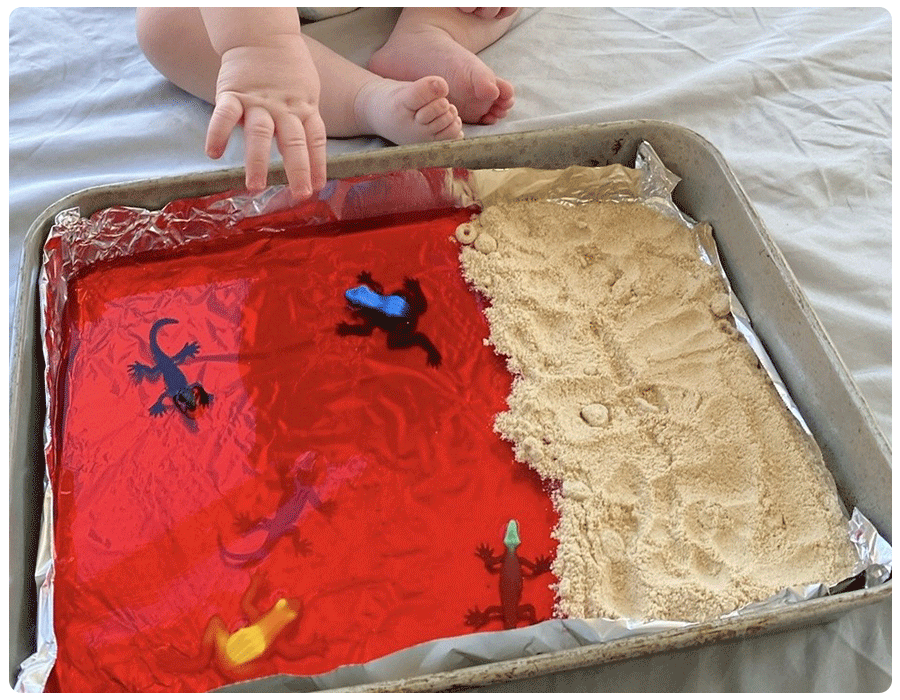 Edible sensory bins are great for babies, and crushed-up cereal and Jell-O provide an intriguing variety of textures. Baby will have a blast trying to “rescue” the toy lizards from the Jell-O.
