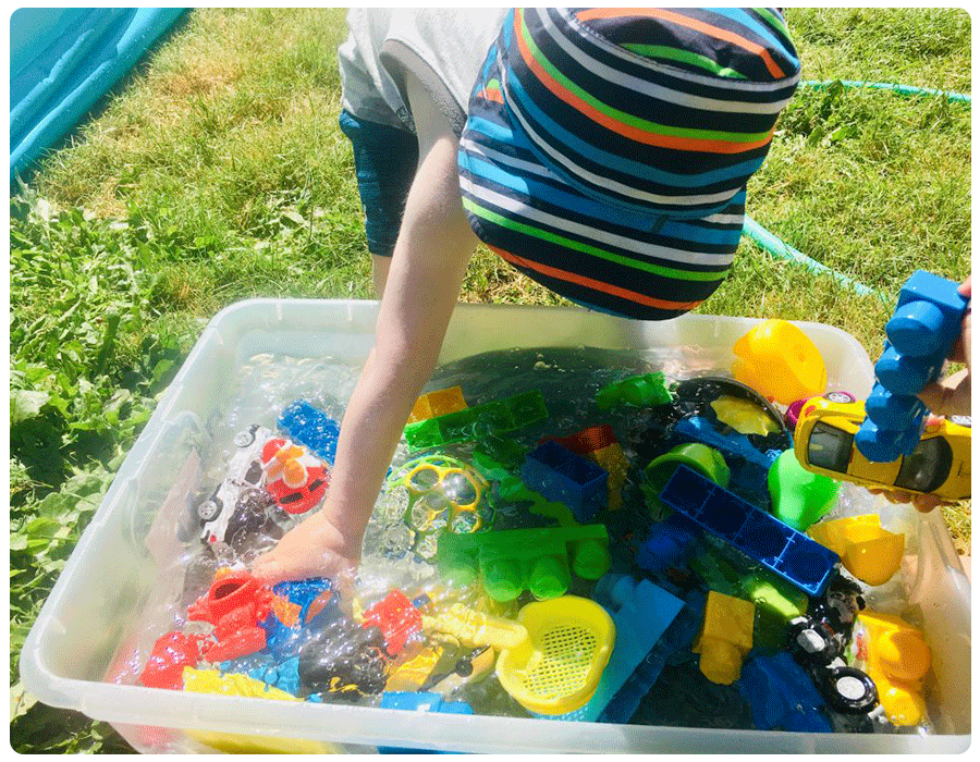 Toy and water sensory bin