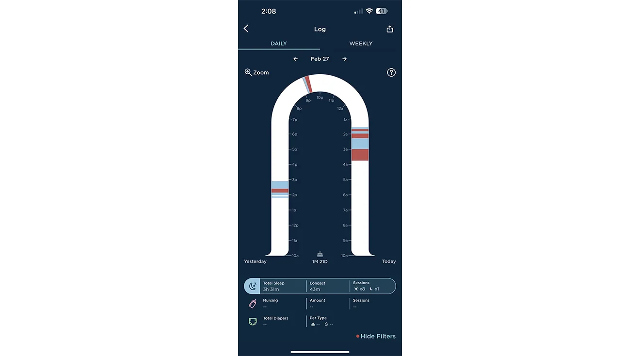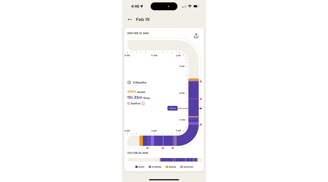The effective sleep analytics were another standout feature for our testers, with useful metrics like total hours slept and longest stretches of sleep. Caitlin was able to use them to identify patterns in her baby’s sleep habits, and reports, “I noticed some nights my baby could sleep until 3 a.m., but some nights he was waking up around 12:30 and whining. As a mom it’s sometimes hard to know when to let your baby cry a couple of seconds and when to jump up and get them immediately. The tracking features reassured me that he could sleep longer stretches of time and he most often was easily soothed back to sleep by the SNOO if he woke up at the 12:30 time.”