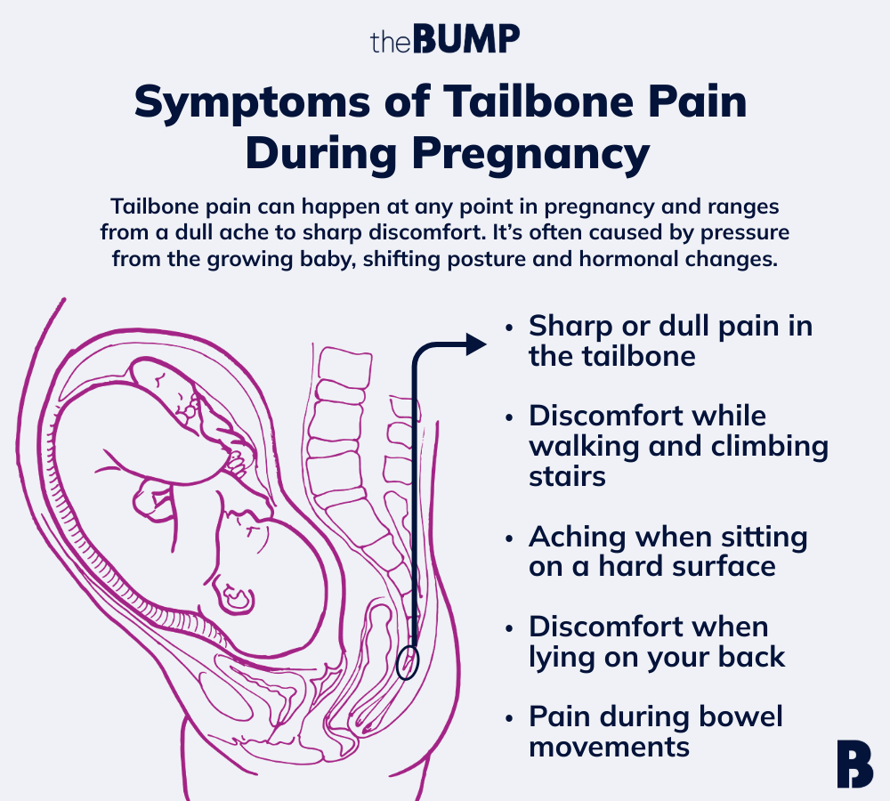 The symptoms of tailbone pain in pregnancy can vary from person to person, but, according to Sherry Ross, MD, an ob-gyn, women’s sexual health expert and co-founder of Oneself Intimate Skin Care, they can include:
