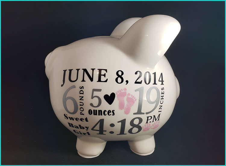A personalized piggy bank teaches the importance of saving—both money and memories! Customize this one with baby’s name and birth stats for a truly unique piece.