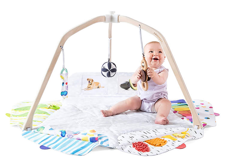 This play gym from Lovevery has everything you could want: a selection of sustainably sourced toys; five fold-out development zones that promote sensory activities, plus a corresponding Play Guide for parents; overhead bars so baby can bat at dangling, detachable toys; machine-washable fabrics and a design aesthetic that’ll fit right into your modern home. Oh, and did I mention that this play mat is a Best of Baby award-winner too?